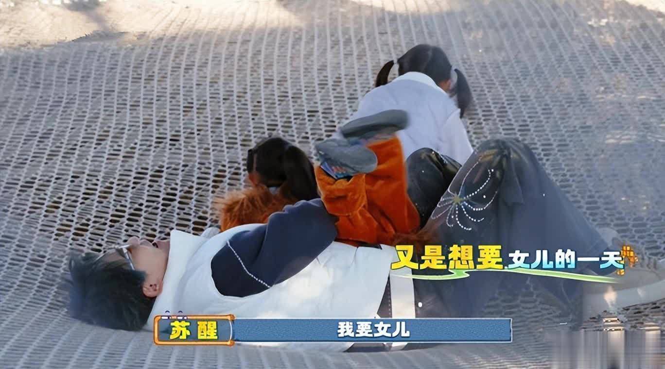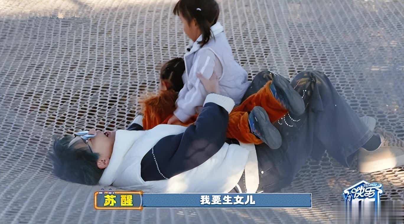 厚米团带着小朋友去玩蹦床时,一直在那蹦个不停的苏醒把所有人都蹦累后,自己也倒下了。倒下没几秒,两个小女孩就扑到苏醒身上开启叠罗汉。这让苏醒很幸福,想要女儿的心又被唤醒了,他说“我要生女儿,我要女儿。”